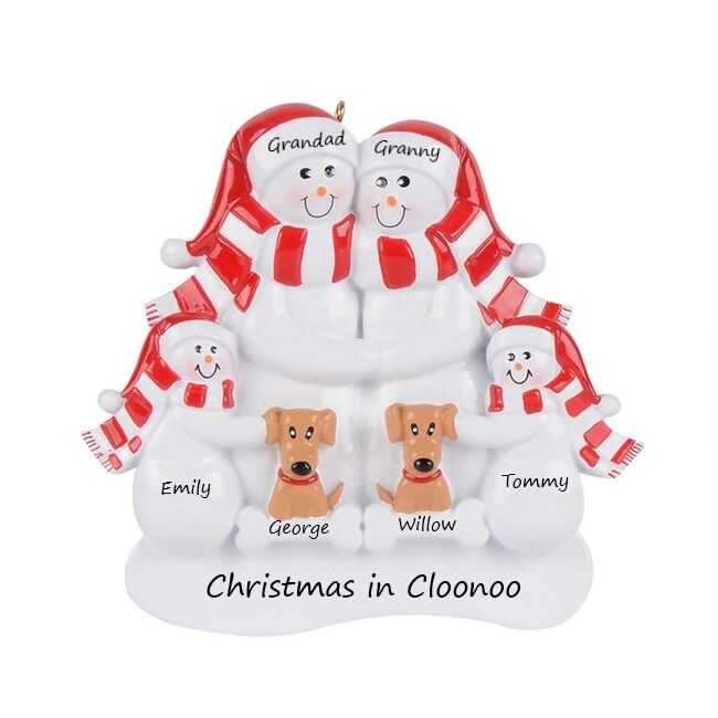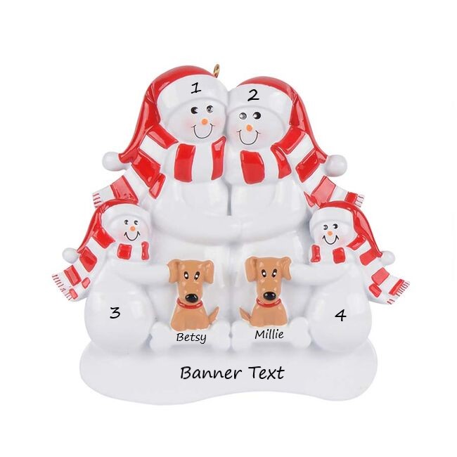 SNOW Family 4 with 2 Tan dogs Personalised Christmas Ornament